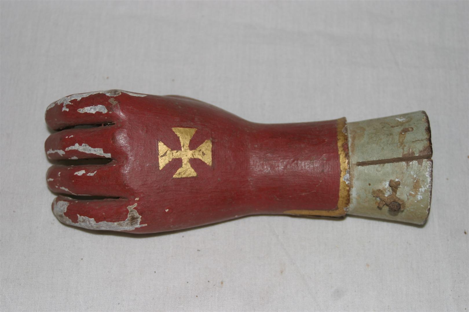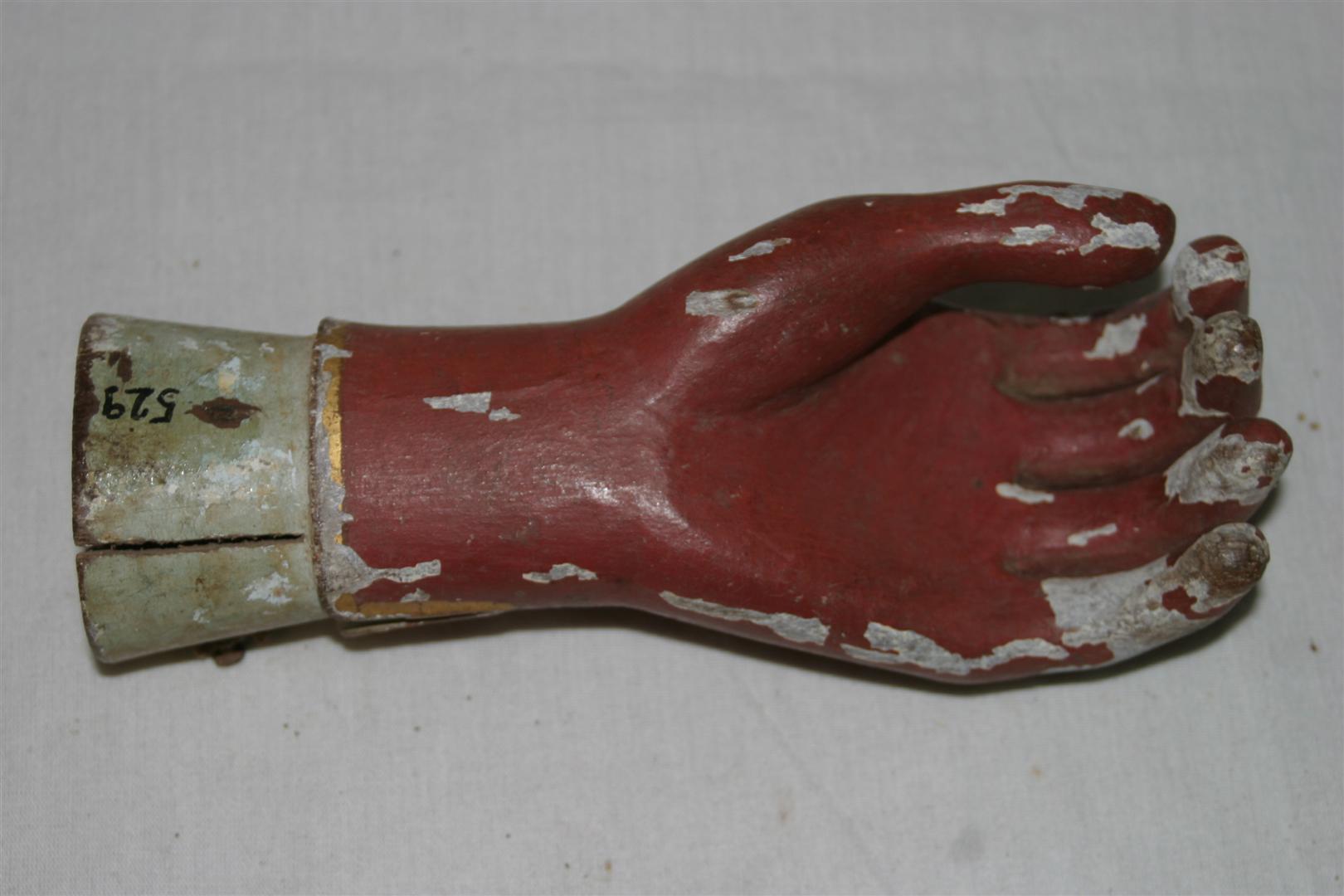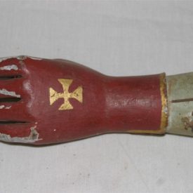 Antebraço e mão de santo de roca (possivelmente de um Cardeal), correspondente ao lado esquerdo, de pequenas dimensões, confeccionado em madeira (jacarandá mineiro) entalhada, policromada e dourada. Peça composta por luva com abertura lateral (à esquerda), em tom vermelho, ornada por barra lisa em dourado, tendo, na parte superior da mão, cruz de malta também dourada. Apresenta pulso delgado com restante do antebraço em tom azul (desbotado), tendo orifício na extremidade para encaixe do restante do braço (este inexistente). Objeto em posição retilínea, com quatro dedos flexionados e polegar reto (possivelmente para segurar atributo).