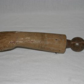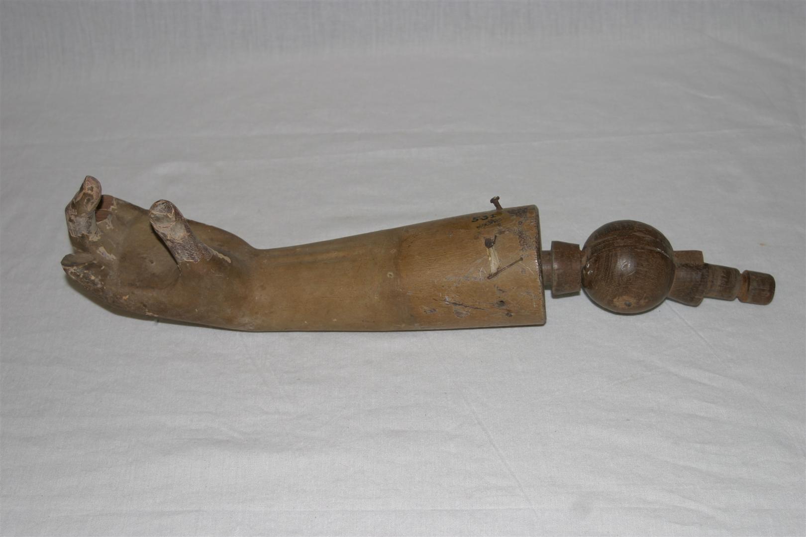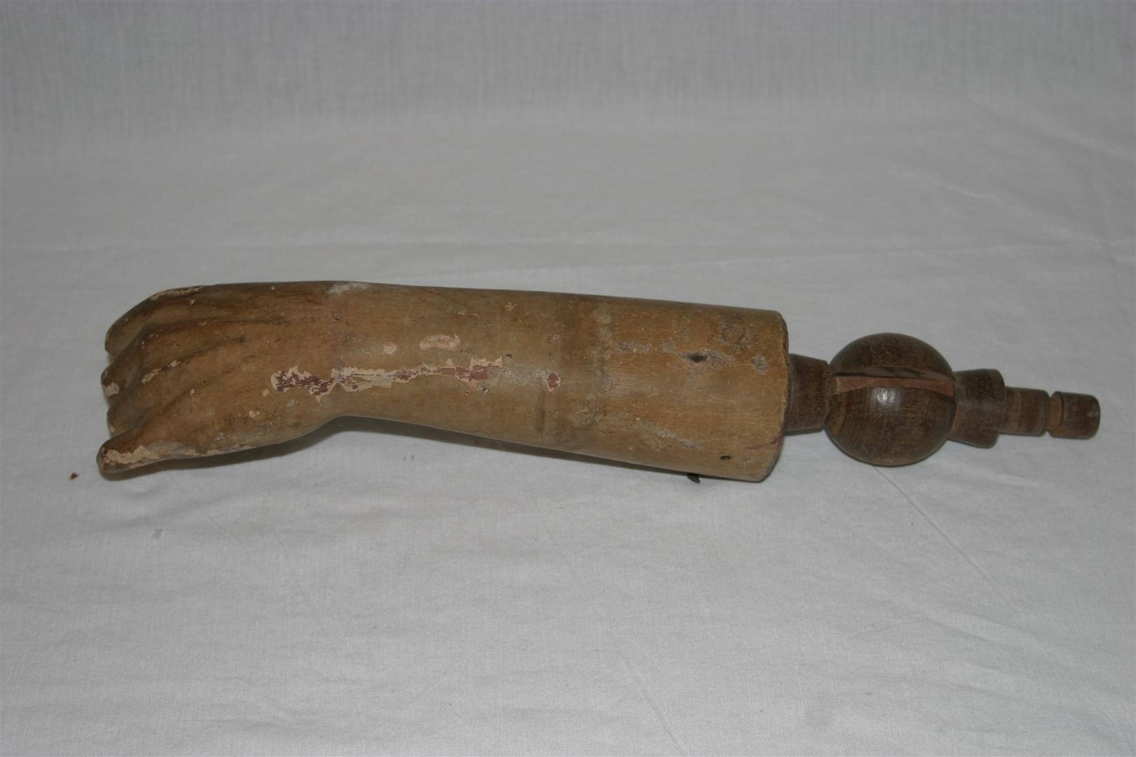Antebraço e mão de santo de roca, correspondente ao lado esquerdo, de dimensões médias, confeccionado em madeira (jacarandá mineiro) entalhada e pintada. Peça de linhas simples e carnação em tom bege, tendo, na extremidade inferior, estrutura composta por esfera e pino para encaixe no restante do braço (este inexistente). Objeto em posição reta, com mão em leve curvatura, voltada para dentro, com dedo médio flexionado (restante dos dedos quebrados) e polegar afastado. Dedos longilíneos, com separação e unhas bem delineadas e pintadas em tom bege. Na parte superior, representação dos ossos em relevo, e, na parte interna do pulso, representação das veias em relevo. Palma de mão lisa. Na extremidade, inscrição (pouco legível) em tinta preta “S...Dº”. Carnação pintada até a metade do antebraço.