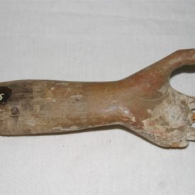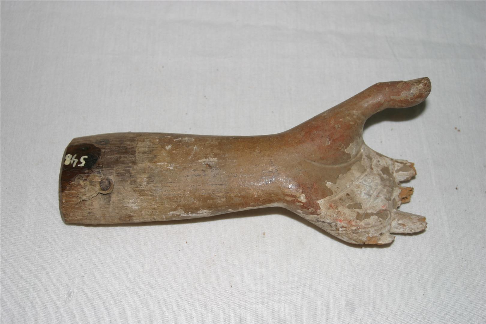 Antebraço e mão de santo de roca, correspondente ao lado esquerdo, de pequenas dimensões, confeccionado em madeira (jacarandá mineiro) entalhada e pintada. Peça de linhas simples e carnação em tom róseo, tendo, na extremidade inferior, estrutura retangular para encaixe no restante do antebraço. Objeto em posição reta, com pulso delgado e dedo polegar afastado (o restante dos dedos encontram-se quebrados), com unha bem delineada e pintada em tom bege. Palma da mão com três traços bem marcados.