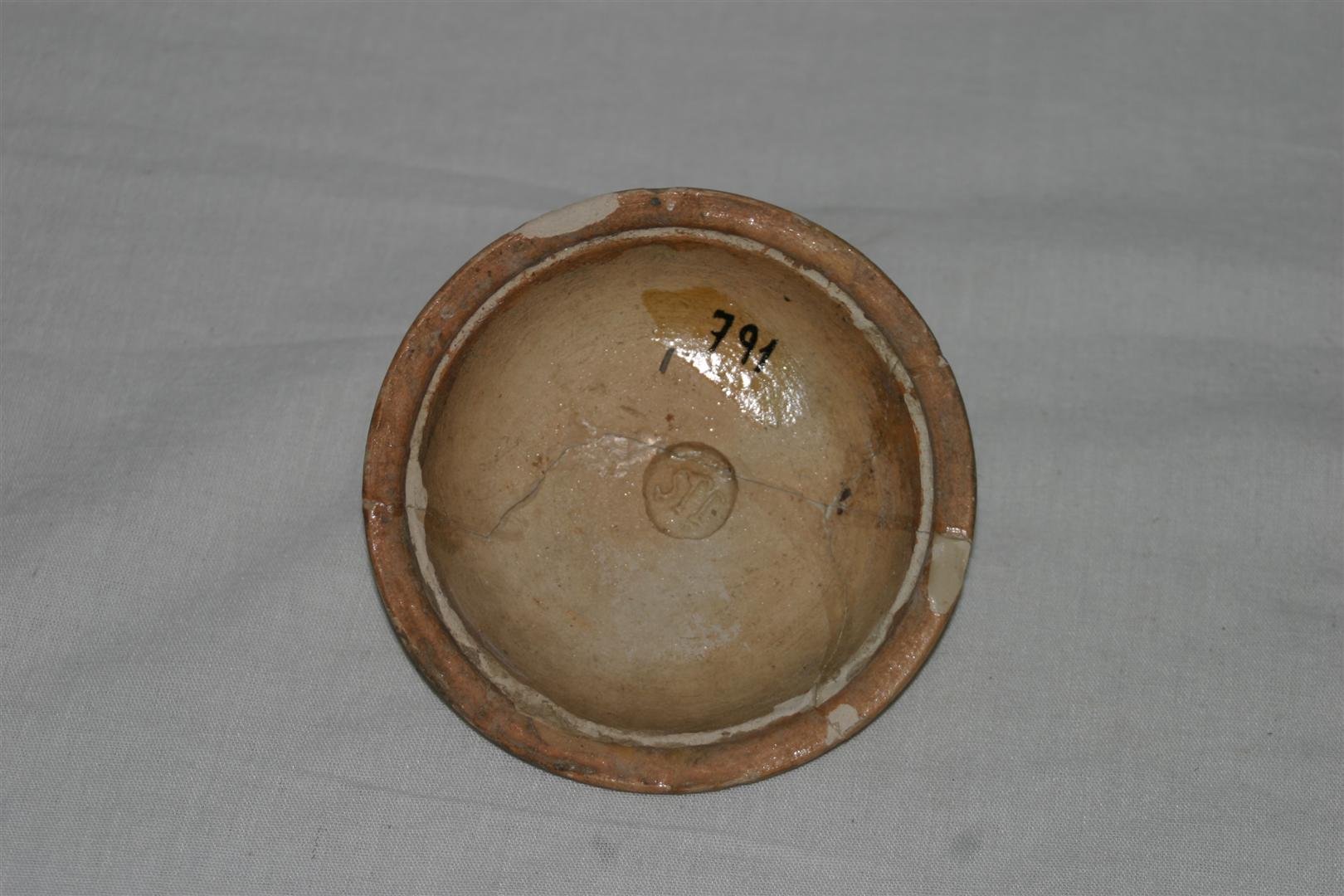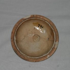 Tampa confeccionada em cerâmica pintada em tom amarelado, de formato circular, arrematada por pino em disco. Apresenta ornamentação na superfície em motivos fitomorfos e florais, nos tons marrom, verde e vermelho, além de friso simples na borda. Na parte interna, inscrição gravada: “JJS” inserida em círculo.