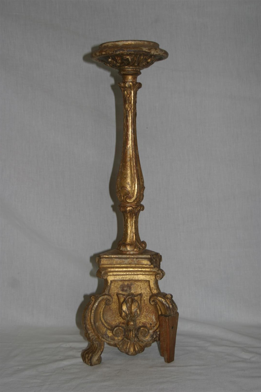 Tocheiro confeccionado em madeira entalhada, torneada e dourada. Apresenta haste vertical encimada por arandela circular na parte superior com orifício central para encaixe da vela. Na face inferior da arandela, motivos fitomorfos em relevo. Haste ornada por três estruturas verticais em gomos ladeados por volutas, tendo abaixo estrutura estriada arrematada por volutas. Haste apoiada sobre placa triangular escalonada. Base em tripé, trifacetada, contendo, em cada face, ornato central em folha de acanto, ladeada por volutas contrapostas. Pés em sapata, contornados por frisos e recortada por estrutura em curva.