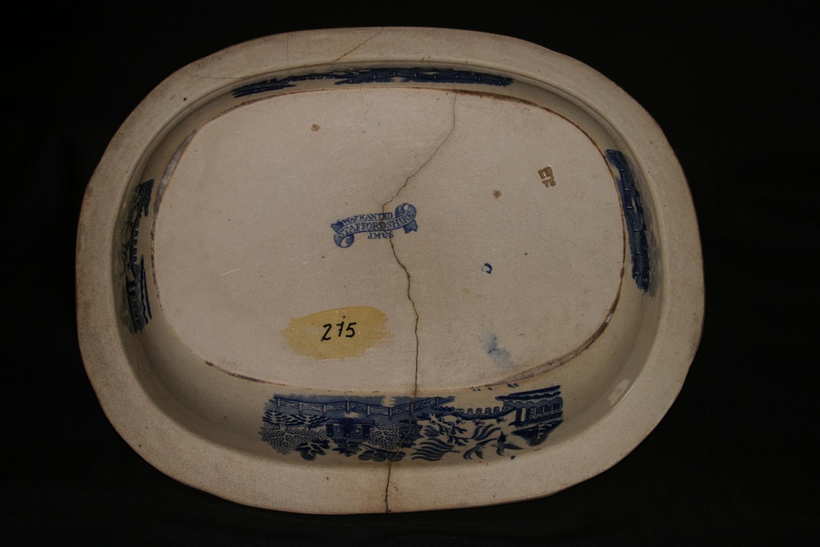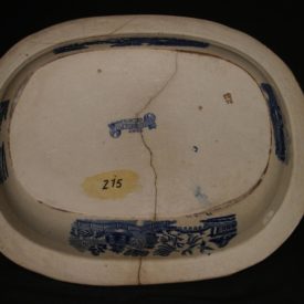 Travessa (funda), de grandes dimensões, confeccionada em porcelana branca e em azul cobalto, do serviço conhecido como “azul pombinho”, de formato ovalado. No campo, cena orientalizada onde aparece, à direita, palácio e pagodes cercados por vegetação típica da região, destacando-se, na parte superior, uma macieira com cinquenta e duas maçãs. Na parte frontal, cerca e gramado, onde se vê salgueiro estilizado encimado por casal de pombinhos. À esquerda da cena, três figuras humanas, com instrumentos nas mãos, atravessam a ponte em direção a uma ilha. Na parte superior, representação do mar com embarcação sendo conduzida por figura masculina. Logo acima, outra ilha com pagode e vegetação. Parte externa contendo quatro desenhos na mesma padronagem, um deles com pagode, macieira com oito maçãs, cerca e vegetação, e o outro com três figuras humanas atravessando a ponte, salgueiro e casal de pombinhos. Borda e friso interno com ornamentação geométrica em losangos, quadrados, motivos fitomorfos, círculos, pontilhados e emolduramentos em volutas (estes somente na borda). Fundo branco com marca inserida em flâmula com a inscrição em azul: “WARRANTED/ STAFFORDSHIRE/ J.M&S”.Em separado:“C”. Incavo: “CF”.