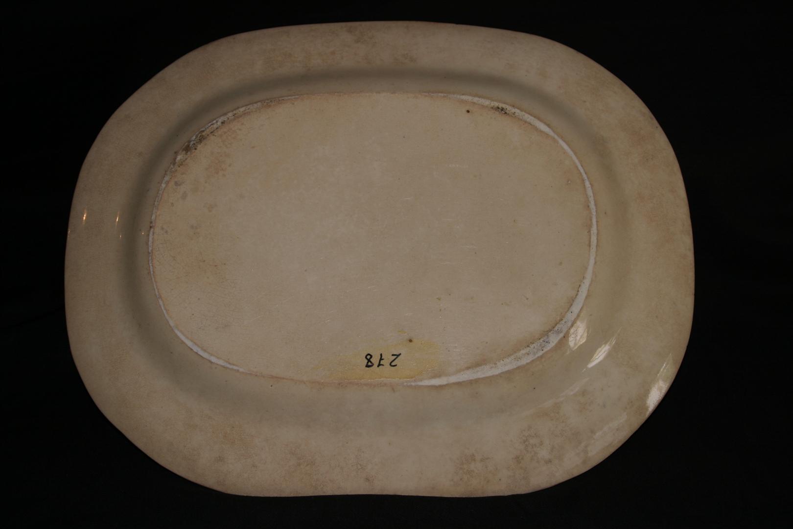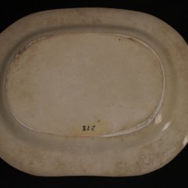 Travessa, de grandes dimensões, confeccionada em porcelana branca e em azul cobalto, do serviço conhecido como “azul pombinho”, de formato ovalado. No campo, cena orientalizada onde aparece, à direita, palácio e pagodes cercados por vegetação típica da região, destacando-se, na parte superior, uma macieira com trinta e oito maçãs. Na parte frontal, cerca e gramado, onde se vê salgueiro estilizado encimado por casal de pombinhos. À esquerda da cena, três figuras humanas, com instrumentos nas mãos, atravessam a ponte em direção a uma ilha. Na parte superior, representação do mar com embarcação sendo conduzida por figura masculina. Logo acima, outra ilha com pagode e vegetação. Borda e friso interno com ornamentação geométrica em losangos, quadrados, motivos fitomorfos, círculos, pontilhados e emolduramentos em volutas (estes somente na borda). Fundo branco liso.