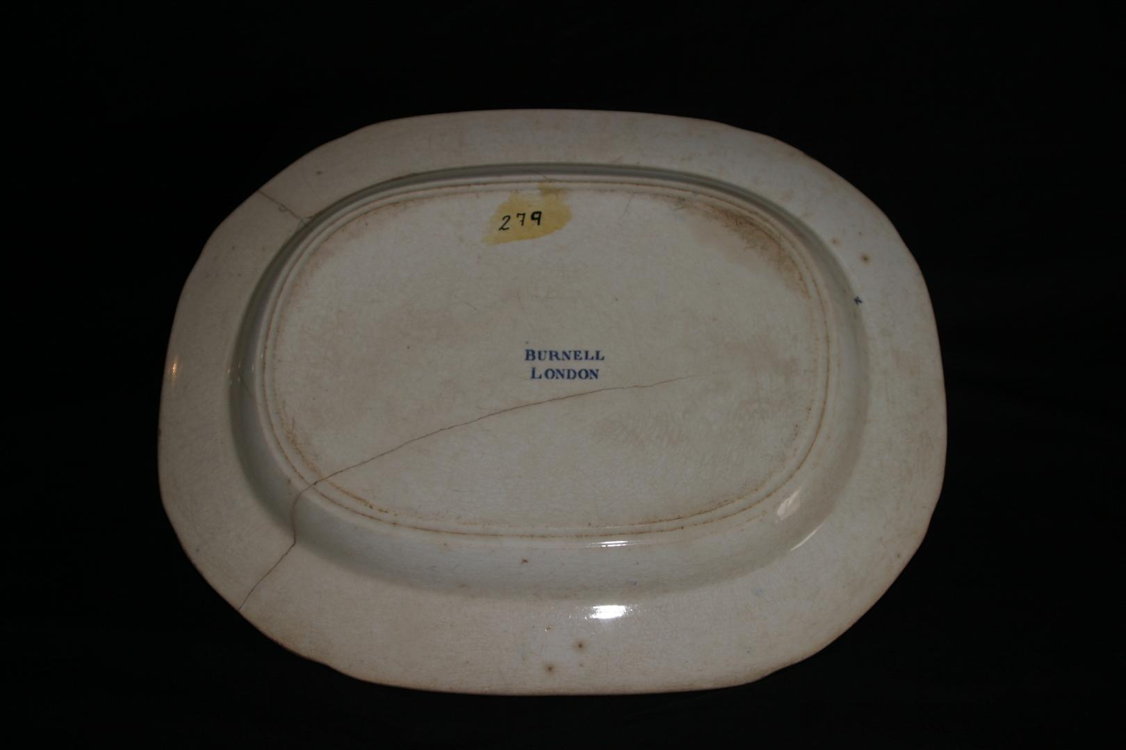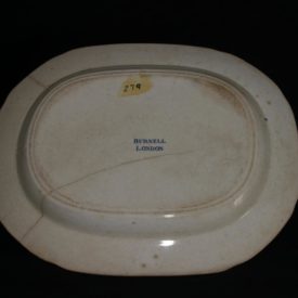 Travessa, de grandes dimensões, confeccionada em porcelana branca e em azul cobalto, do serviço conhecido como “azul pombinho”, de formato ovalado. No campo, cena orientalizada onde aparece, à direita, palácio e pagodes cercados por vegetação típica da região, destacando-se, na parte superior, uma macieira com cinquenta e sete maçãs. Na parte frontal, cerca e gramado, onde se vê salgueiro estilizado encimado por casal de pombinhos. À esquerda da cena, três figuras humanas, com instrumentos nas mãos, atravessam a ponte em direção a uma ilha. Na parte superior, representação do mar com embarcação sendo conduzida por figura masculina. Logo acima, outra ilha com pagode e vegetação. Borda e friso interno com ornamentação geométrica em losangos, quadrados, motivos fitomorfos, círculos, pontilhados e emolduramentos em volutas (estes somente na borda). Fundo branco com a seguinte inscrição em azul: “BURNELL/ LONDON”