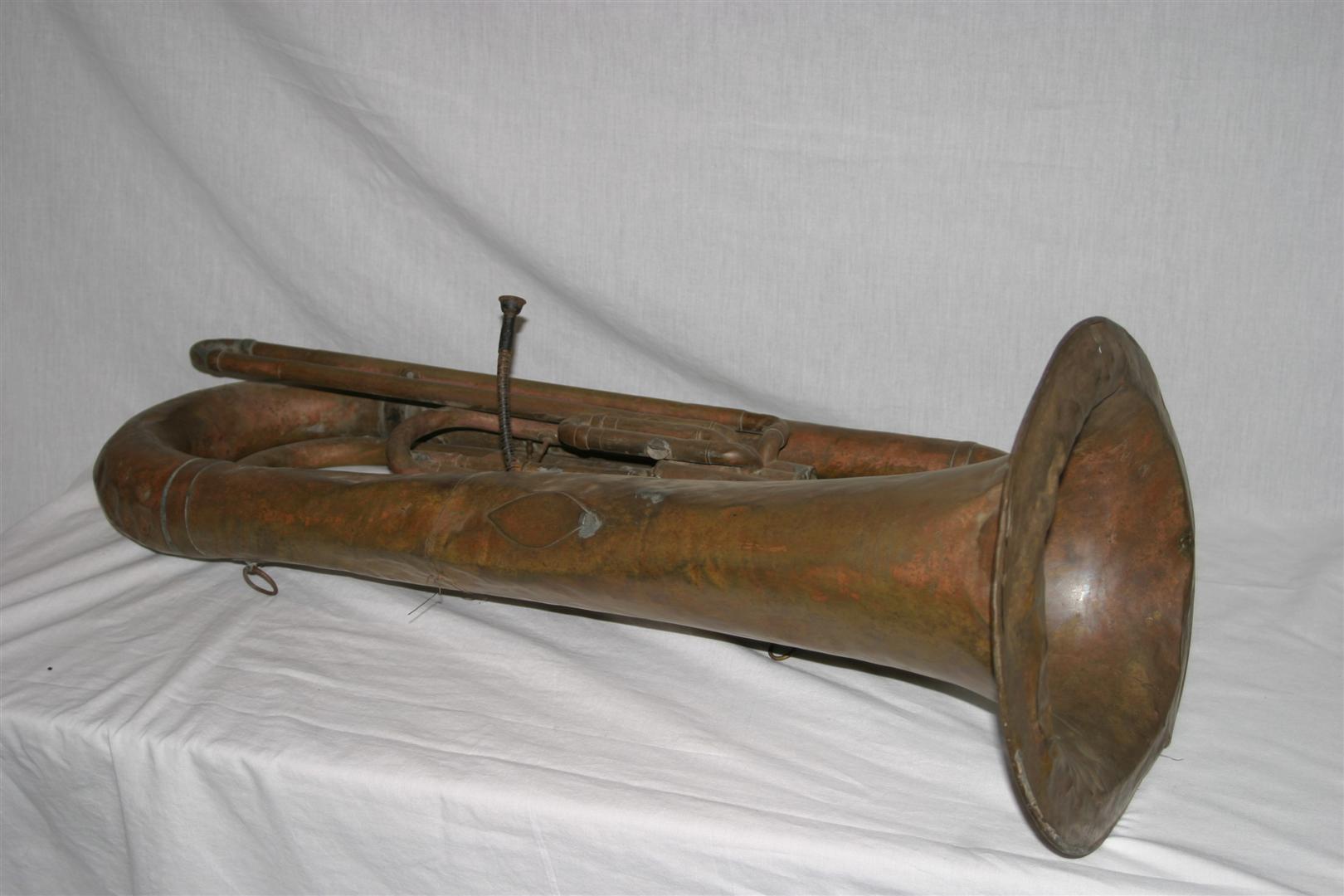Instrumento musical de sopro, de médio porte, identificado como tuba, confeccionado em metal amarelo (cobre e latão). Apresenta estrutura cilíndrica delgada e comprida, dobrado, com pavilhão largo e circular, além de três pistões. Apresenta chaves e embocadura.